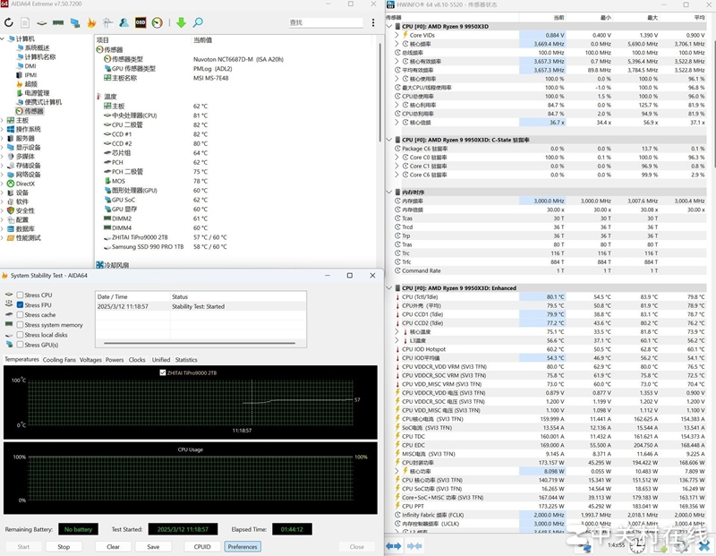 AMD 锐龙9 9950X3D在微星 X870E GODLIKE超神主板上使用AIDA 64进行FPU拷机一个半小时以上,最终平均温度在79.8℃,封装平均功耗168W左右,温度表现不错,毕竟部分生产力和游戏大幅领先隔壁,温度整体还更低,说明这代ZEN5和第二代3DV缓存确实优化很好,这种温度和功耗对于微星 X870E GODLIKE超神主板也没有任何压力所言。