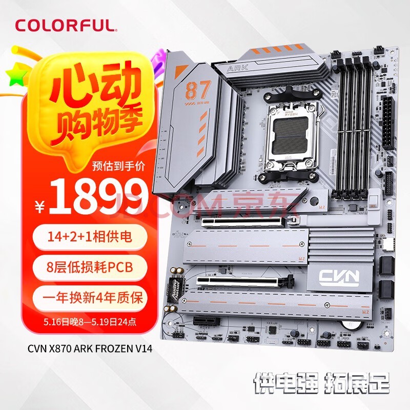 CVNX870ARK方舟延续了CVN军工元素搭配灰色设计主题,采用大面积CNC精工工艺雕琢的散热装甲,将层次分明的硬朗线条与电脑硬件完美结合,呈现出别具一格的硬朗科技感。搭载14+2+1相豪华供电模组,其中核心采用80A高规格DrMOS,配合高性能片式聚合物电容,满足AMD锐龙99950X3D旗舰处理器性能全开;支持高达8200MHz以及X3DGame Mode与低延迟模式,并搭载5G+WiFi 7电竞网络,为玩家提供更高速的电竞体验。目前该主板活动价为1899元,还能参与京东白条三期免息优惠,非常适合搭配AMD锐龙79800X3D及以上X3D系列处理器打造一台超帅气的白色电竞主机。