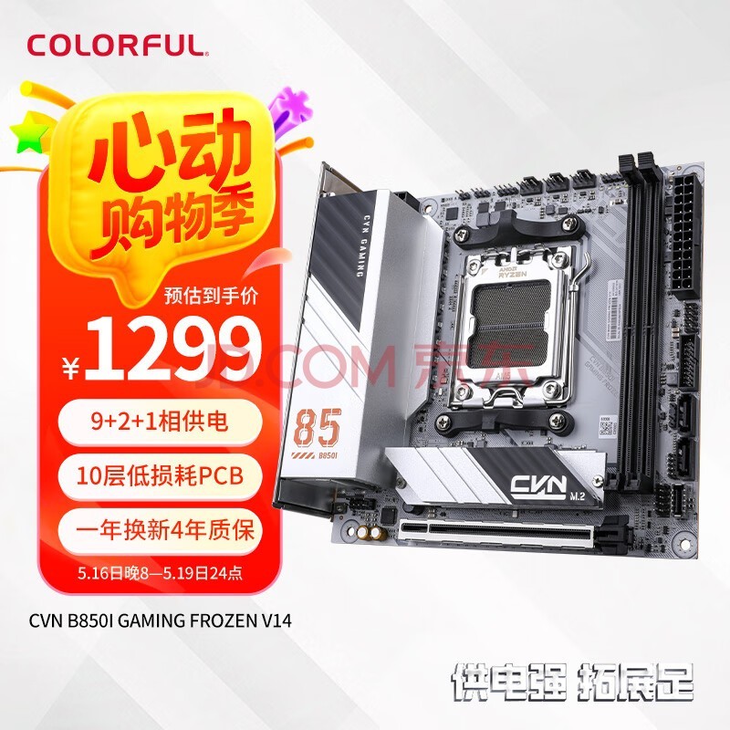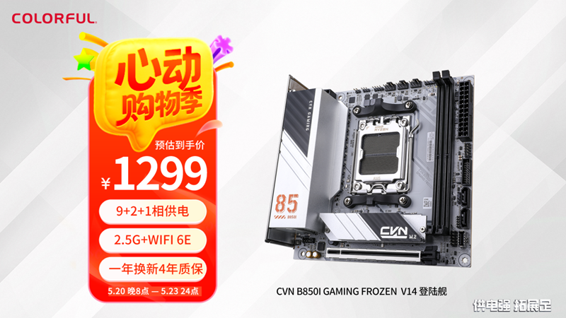 CVNB850I登陆舰延续了上一代家族式小巧设计,在VRM散热装甲上铭板上设计有“舷号85”,同时采用银白配色,突出了军事风格的硬朗气质。采用9+2+1相60ADrMOS供电设计,轻松应该AMD锐龙79800X3D热门游戏处理器,双内存槽可支持高达8000MHz的双通内存;内置2个M.2固态硬盘接口和2个SATA接口,为以后升级留下空间;自带一体式IO面板,拥有8个USB接口其中一个10G的USB-C接口,还配备了主流的2.5G+WiFi6E高速网络组合。目前是市面上少有的银白色ITX锐龙主板,非常适合搭配锐龙79700X/9800X3D处理器打造小巧游戏小钢炮,目前该主板在七彩虹京东自营旗舰店活动价格为1299元,还有随机满减券,最低到手价仅1249元。