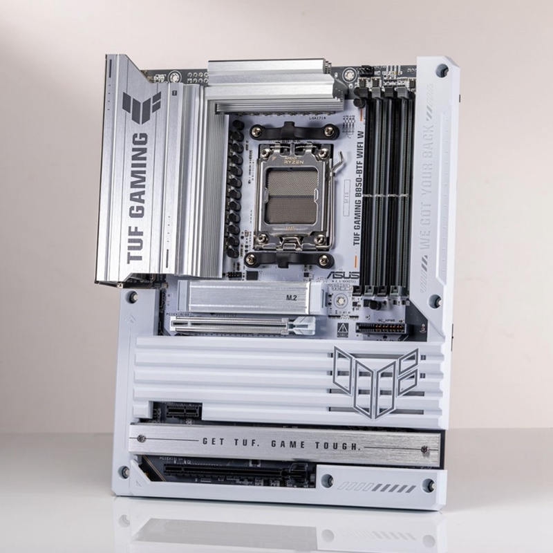 展区同步带来TUF GAMINGB850-BTF WIFI W背置主板。作为华硕首款AMD BTF主板,以银白配色演绎利落机甲风格,搭配背置接口设计,带来更干净的整机视觉与更便捷的安装体验。高效稳定的供电设计与扩充能力,满足玩家打造白色无线主机的需求。