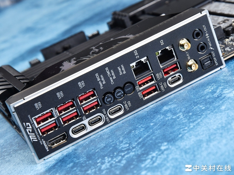 下面来看一下I/O拓展,微星 X870E 暗黑主板已经没有USB 2.0接口了,但拓展能力堪称恐怖,因为它直接提供了9个10Gbps速率的USB 3.2 Gen 2 Type-A 接口,2个10Gbps速率的USB 3.2Gen 2 Type-C 接口,以及2个40Gbps的USB4接口。拓展能力也是AMD暗黑主板系列前所未有的强大。同时还提供一个HDMI接口,两个网口分别为5G和2.5G,还有一个WIFI 7天线接口,以及三个快捷按钮,分别为Flash BIOS Button、Clear CMOS Button和Smart Button。