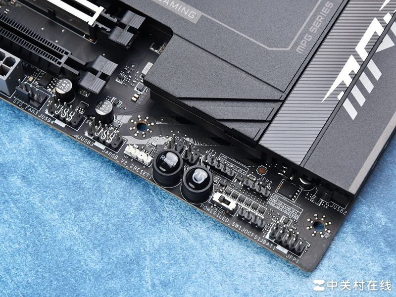 这款主板总共提供3个5V 3PIN ARGB灯针和一个12V4PIN ARGB灯针,在底部的开关重启快捷按钮旁边还准备了独立的RGB开关,用来直接调整整机光效。