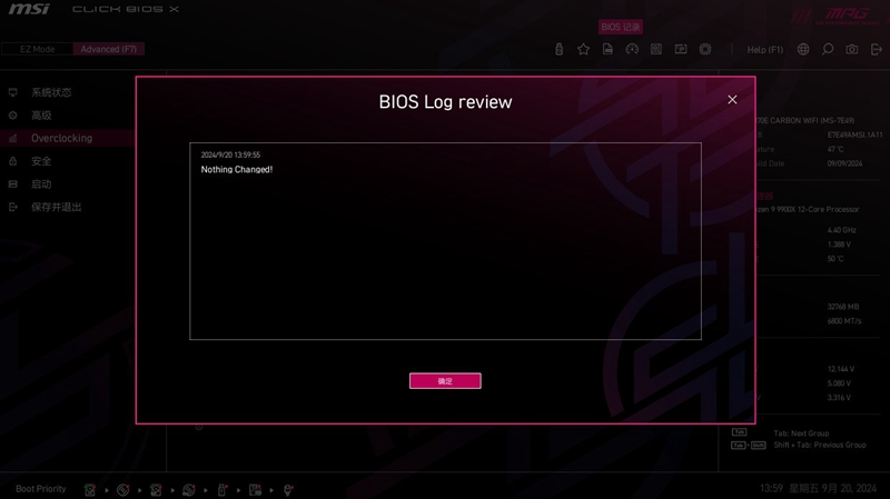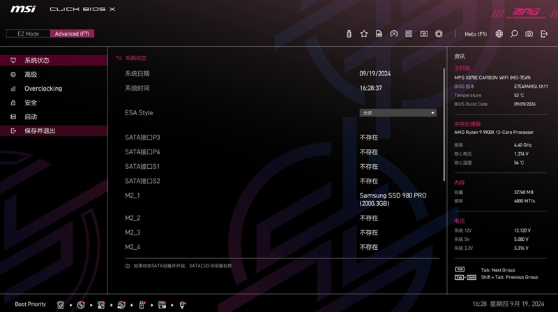 除了EZ Mode下的快捷功能外,我们在看一下微星BIOS其他进阶设置的变化。按F7进入高阶模式,首先来到系统状态菜单,可再次查看检测到的所有硬件信息。
