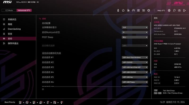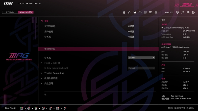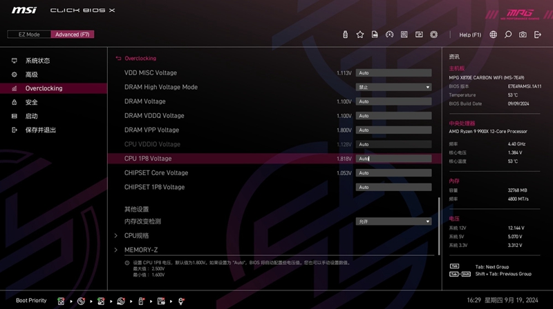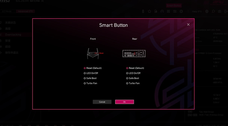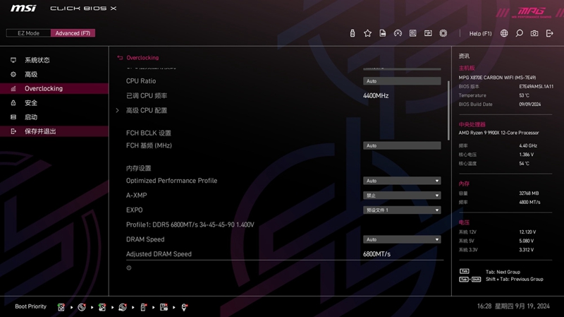微星目前对这款暗黑主板BIOS风格进行了精简,EZ Mode主菜单增加了更多重要参数设置,如CPU、内存、NPU、PBO这些设置一键超频开关,还能在右侧直接看到核心参数。