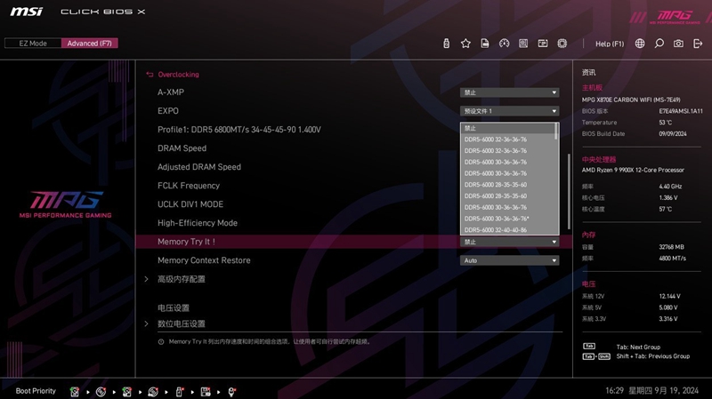 内存一些重要一键超频功能也都完整,包括之前就有的High Efficiency mode自动优化小参以及Memory Try It超频预设,两个可以搭配一起使用,实现一键超频和性能调优。