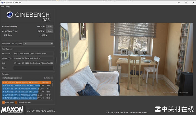 锐龙9 9900X在CINEBENCH R23上最终单核得分2162,多核得分34306,可以看到锐龙9 9900X在微星 X870E 暗黑主板发挥出了全部性能。