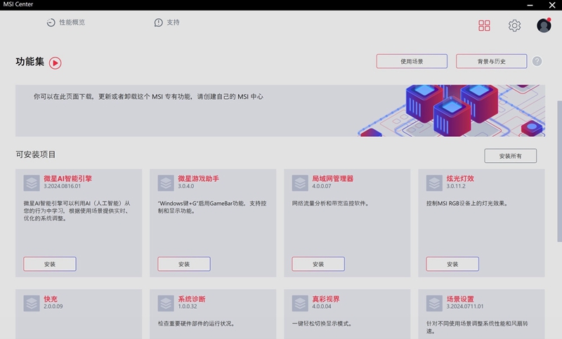 开机之后会提示安装MSI Center,这是微星电脑管家类的软件,目前支持自定义功能集,大家可以选择需要的功能进行下载安装。