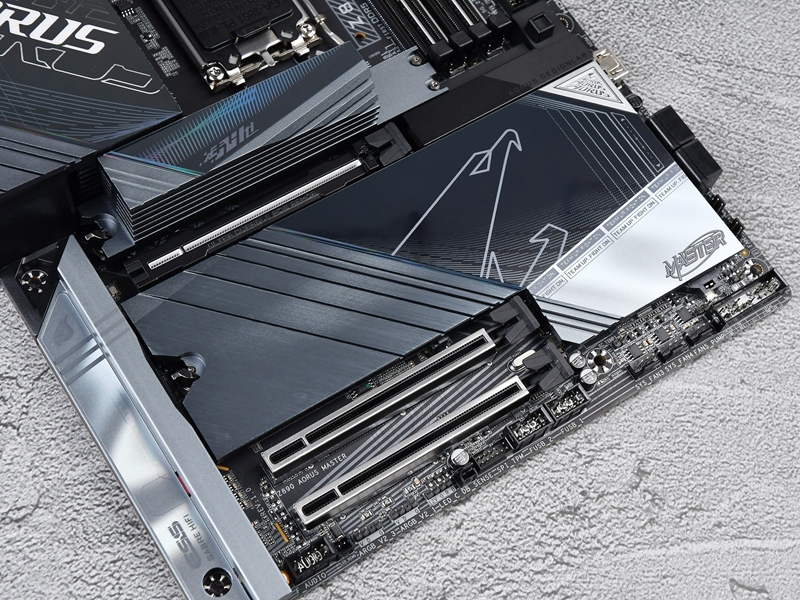 技嘉 Z890超级雕主板板载5组M.2插槽,两组使用双向散热垫的插槽支持PCIe 5.0,剩下三组使用了PCIe 4.0。