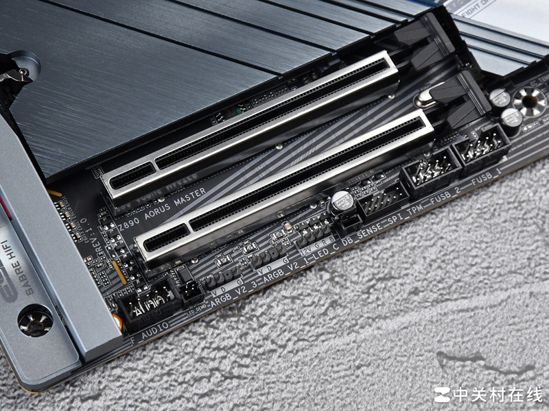 技嘉 Z890超级雕主板总共有3组PCIe长插槽,顶部采用了PCIe 5.0 x16采用超耐久显卡插槽设计,最高承重甚至能达到58KG,对于旗舰高端显卡可以提供很好的保护。剩下两个显卡插槽也使用了金属加固,一根带宽为PCIe 4.0 x4,一根为PCIe 4.0 x1。