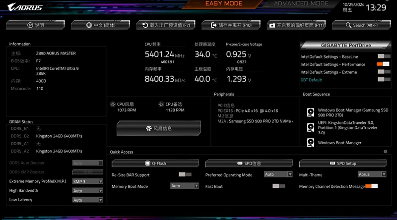 酷睿Ultra 200S一大特点是频率显著提升,所以我们首先测试了一下技嘉 Z890超级雕主板平台内存上面的表现。我们首先直接开启手里这组内存的XMP 8400。