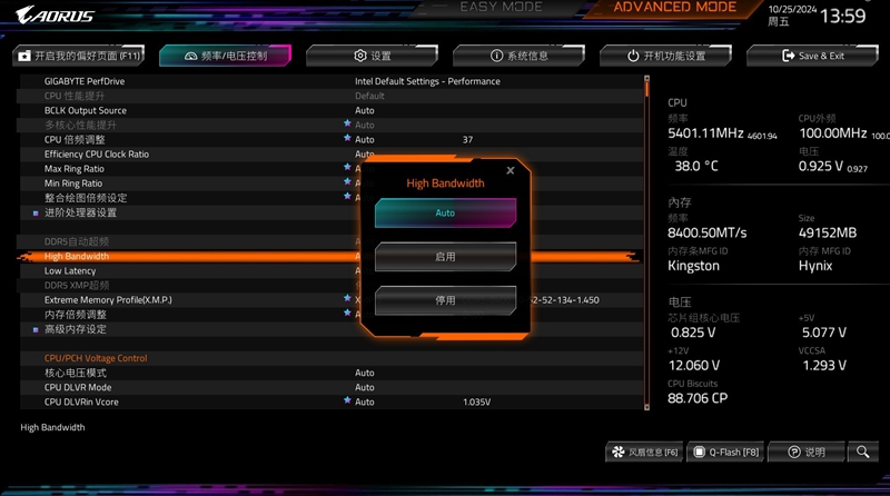 旁边是最重要的OC超频菜单,技嘉主板重要的超频参数都在这里设置,支持CPU性能提升这项一键提升酷睿Ultra 200S性能的功能,高端散热用户可以酌情开启。