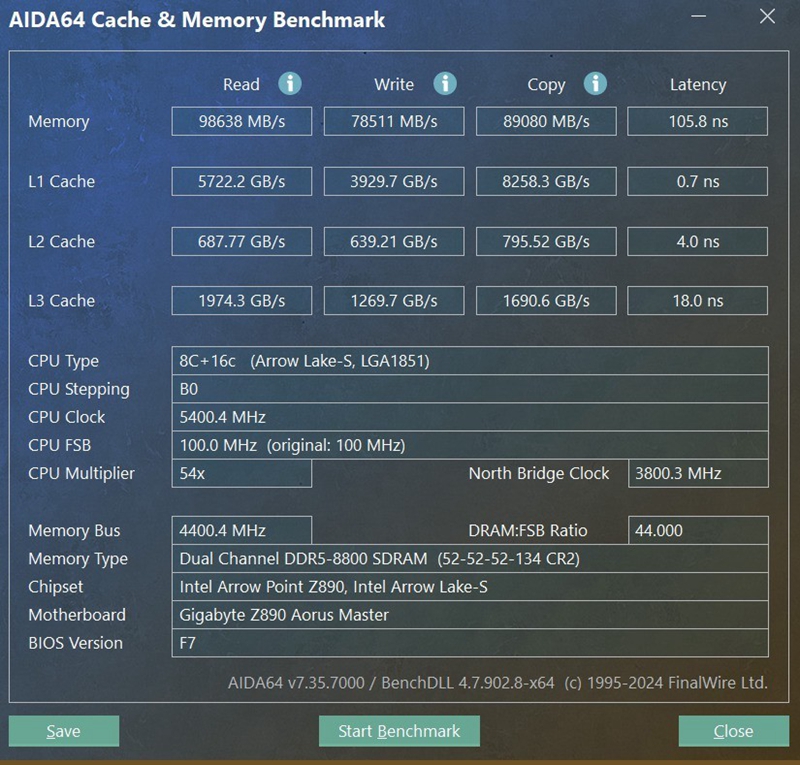 对于能够支持到DDR5 9500的技嘉 Z890超级雕主板XMP 8400确实轻轻松松,没有任何压力可以直接开启,内存读写性能也表现十分出色。