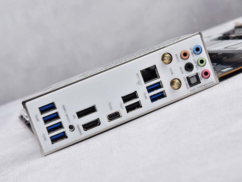 主板在后部的I/O区域布局了8个USB-A接口以及一个USB-C 40G接口,2.5G网线接口,一组WiFi天线接口,一组音频接口,以及CLR_CMOS按键帮助玩家快速还原主板参数。