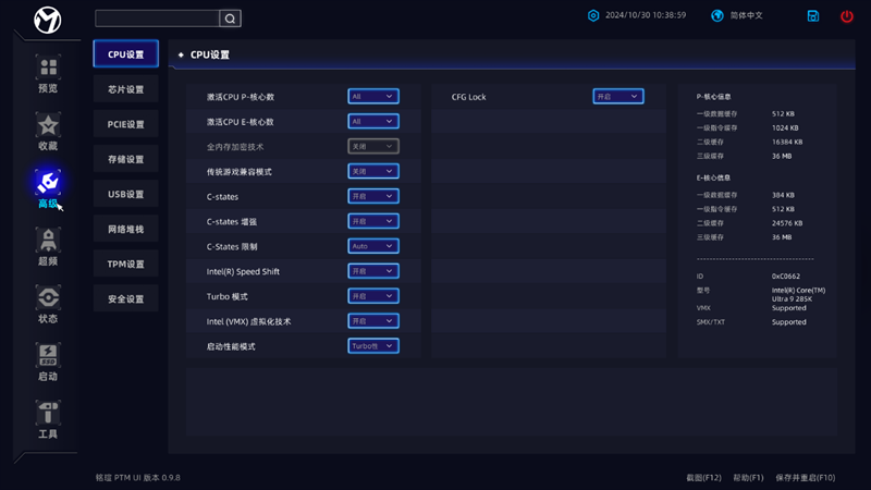 游戏玩家和专业用户会对硬件进行调优,在高级页面就提供了多项参数调整功能,包括CPU设置,芯片设置,PCIe设置,存储设置,USB设置,网络堆栈,TPM设置,以及安全设置,细化的功能都可以在这里进行调节。