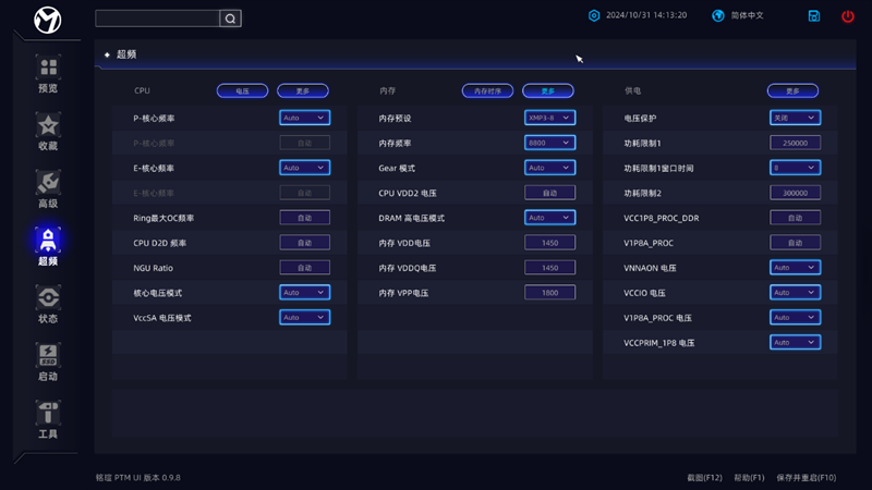 超频页面则围绕超频进行了参数设置,包括CPU的P核设置,E核设置以及电压模式,内存的Gear模式以及电压,在更多选项中提供了更加细化的参数调整,右侧则针对功耗和电压进行了设置。