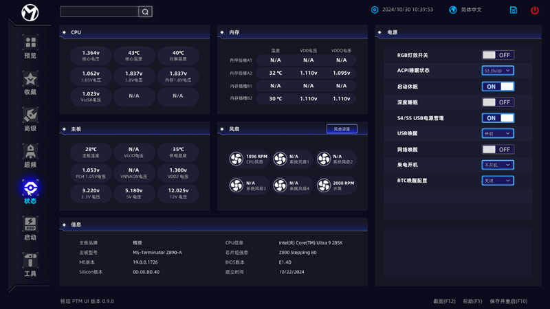 在开始测试之前,我们先进入BIOS界面体验一下铭瑄 Z890-A WiFi主板心流式交互设计的PTMUI BIOS。这款主板的BIOS采用了交互式的图形界面,包含预览,收藏,高级,超频,状态,启动以及工具7界面,每个又提供了详细的状态和设置,操作起来简单得多,而且BIOS界面的右上角全程都有语言选择和保存的选项,非常人性化。
