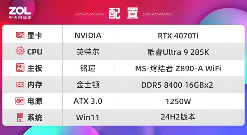 设置完BIOS之后,我们就进入系统进行实机测试。本次铭瑄 Z890-A WiFi主板的性能测试主要关注CPU及内存的性能释放,生产力表现以及游戏性能的表现,测试平台搭配的是酷睿Ultra 9 285K,具体的平台配置如下。