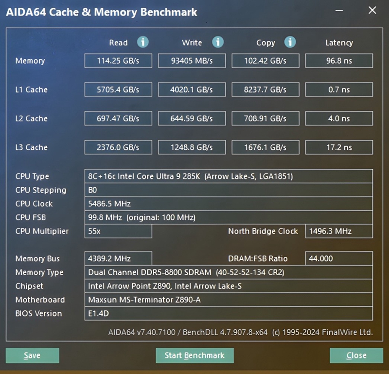 从测试结果来看,铭瑄 Z890-A WiFi让内存成功攀上了8800MT/s,性能表现也非常惊人,内存读速达到了114.25GB/s,写速达到了93.4GB/s,延迟则是96.8ns,超频还是非常轻松的。