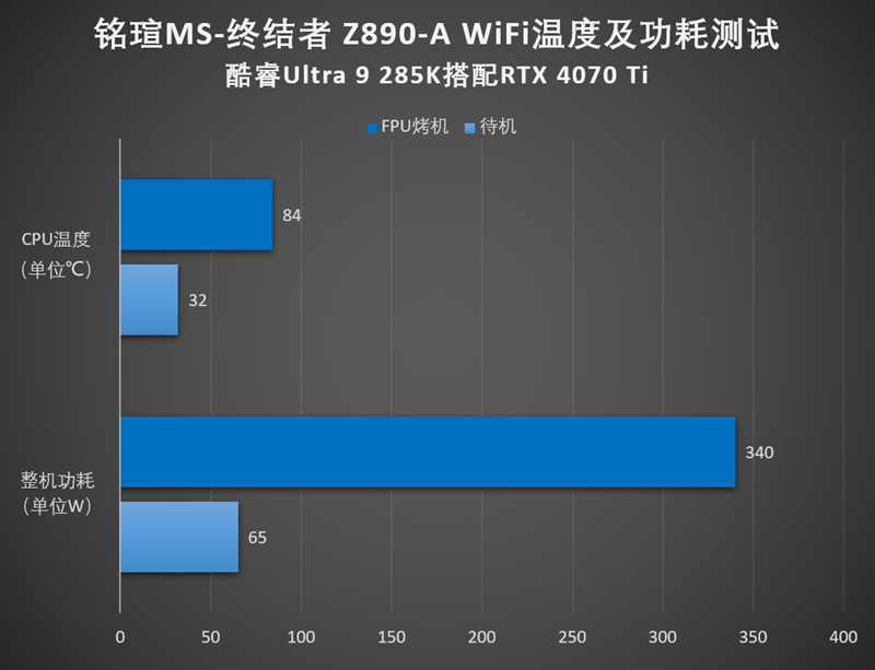 在待机环境下,整机的功耗仅有65W,此时CPU温度仅有32℃,在拷机20分钟之后,整机的功耗稳定在340W左右,此时CPU的温度控制在84℃,整体的功耗和温度表现都远优于前作酷睿i9-14900K,整体的能效更强,对散热器的压力也小了很多,铭瑄 Z890-A WiFi的稳定供电也功不可没。