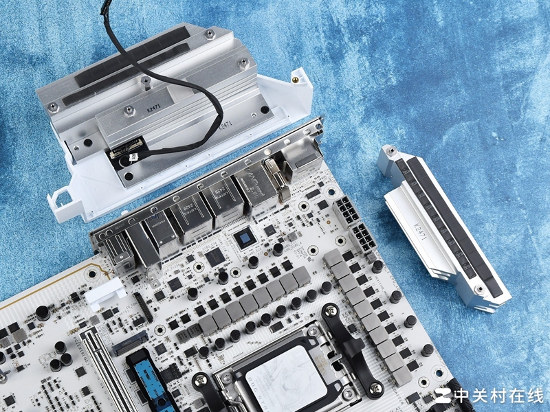 I/O区域,华硕ROG X870吹雪S主板的接口十分丰富,这款主板配备了12个USB接口在后置区域,包含4组USB 3.2 Gen1 Type-A接口,5组USB 3.2 Gen2 Type-A接口,一组USB 3.2 Gen2 Type-C接口,注意这个C口支持PD 30W快充,此外还有两个个重量级USB4接口,支持DP Alt 模式。其余接口包含一个DP接口一个HDMI接口,一个2.5H有线网口和WIFI7网卡天线接口。