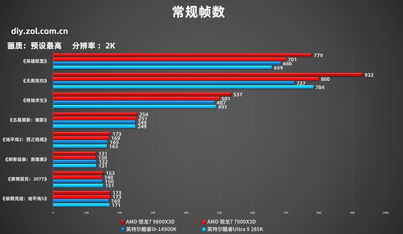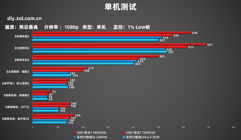 在1080p的帧数测试中,AMD 锐龙7 9800X3D占据了明显的领先优势,在我们测试的这8款游戏测试中,不管是网游还是单机,都有更强的帧数表现,甚至一些网游测试中出现了大幅领先的情况,领先帧数高达百帧以上。