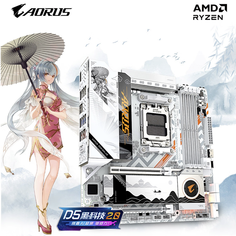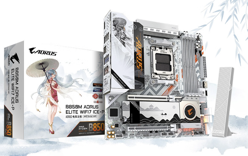 最近技嘉发布了一款雕妹B850M AORUS ELITE WIFI7 ICE-P主板。对技嘉雕妹系列熟悉的用户应该知道,技嘉基于雕妹IP虚拟形象曾经推出过不少主板,有二次元女仆风,也有邻家小太妹风,可爱与纯欲兼具。这款全新风格雕妹主板技嘉与之前的雕妹风格都不同。这次技嘉以东方美学为基底,将泼墨山水的写意与主板精密元件融合,为技嘉 B850M主板打造了以国风为韵全新美学体验。