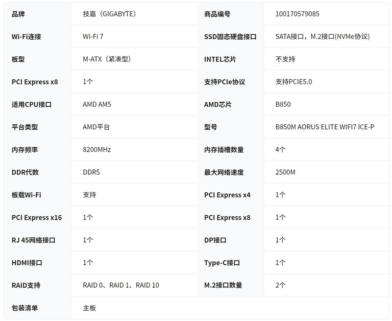 技嘉 B850M AORUS ELITE WIFI7 ICE-P主板DDR5支持AMD CPU AM5 9700X 9950X 9900X 9600X