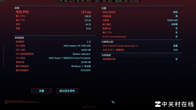 我们也用《赛博朋克2077》自带的Benchmark测试了一下帧数,平均FPS达到了127.04,确实能让大部分游戏玩家3A游戏视觉得到满足。