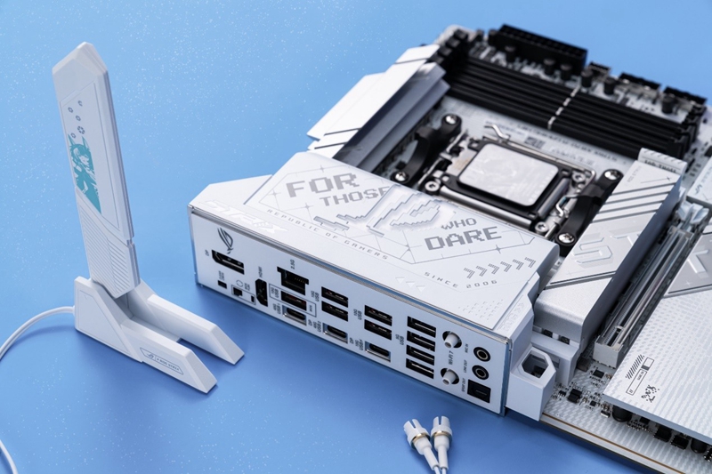 拥有丰富的USB接口,更板载2个USB4接口,传输速度高达40Gbps。网络方面,配备2.5G有线网卡和WiFi 7,加上AI智能网络2.0,提供更快、更稳定的网络体验。雪武战姬主题的银白易拆式天线支持即插即用,在优化WiFi天线安装体验的同时,提高无线性能。