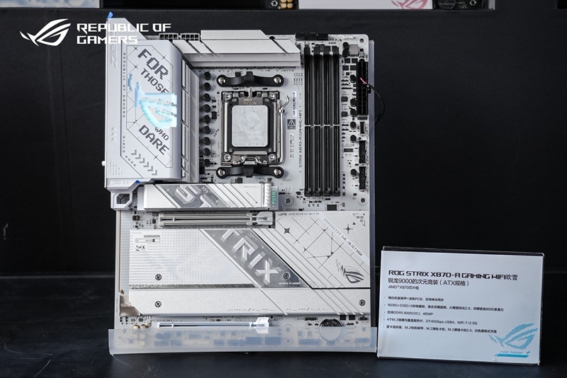 万众瞩目的AMD锐龙79800X3D游戏处理器终于正式登场,其强劲的游戏性能让其成为打造旗舰游戏主机的最佳选择。而想充分发挥锐龙79800X3D性能,现场展示的这三款AMDX870系列的ROGSTRIX X870E-E GAMING WIFI、ROG STRIX X870-A GAMING WIFI吹雪和TUF GAMING X870-PLUSWIFI主板就是绝佳CP。颜值与配置都相当能打,均支持混合双模超频和AI智能超频,能更大程度挖掘9800X3D的潜力。其中ROG STRIX X870E-E GAMING WIFI加入NitroPath内存优化,通过重新调整金手指的设计,缩短了stub(残线)的长度,增加了内存的超频空间和稳定性。二次元与游戏双料爱好者就很适合ROG X870吹雪主板,银白色调的装甲和PCB,轻松打造高颜值的白色游戏主机。