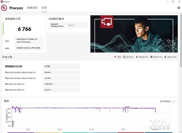 UL Procyon还可以测试视频编辑,主要使用Adobe Premiere Pro对H.264及H.265代码的1080p和4K视频分别进行输出,检验视频求出的效率,最后得出打分。前几代Adobe Premiere Pro对AMD处理器并不友好,不过与PS一样,这款旧版Adobe Premiere Pro也对AMD处理器进行了多核优化,如今在PR剪辑上AMD已不再是强势项目。