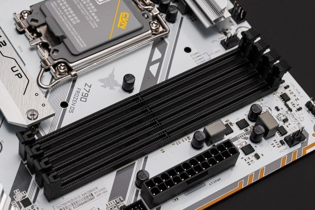 主板上有四个DDR5内存插槽,最大容量为128G。配合DDR5-6400MHz内存,打开主板内置英特尔XMP技术,带来极致的高性能内存体验。