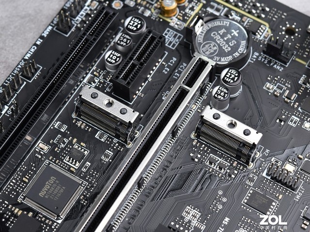 主板配备了两个PCIEX16长插槽,顶部支持PCIE4.0x16带宽,直接连接到CPU,并用金属装甲加固。剩下的是PCIE4.0x4带宽,PCH。