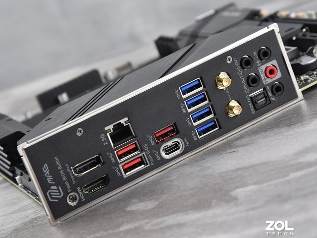 I/O区域,预装I/O挡板已成为迫击炮的标准配置,微星 B650M MORTAR WIFI主板也不例外,这款主板拥有丰富的USB接口,包括4个USB3.2Gen1接口,3个USB3.2Gen2 Typea接口,一个USB3.2Gen2x2TypeC接口。同时提供一个DP接口和一个HDMI接口DMI接口。此外,还有Wi-Fi6E无限网卡和2.5G有线网口。