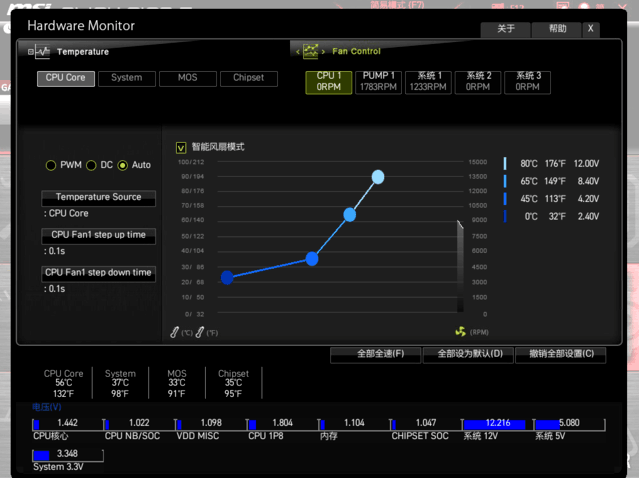 经典的微星Hardwaremonitor温控界面,可以调节每个风扇的转速。