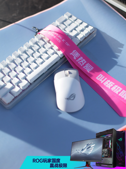 在外设方面,主机配备了ROG月刃无线AP36K白鼠标和ROG导游竞技键盘,配合ROG泰毯樱花粉限量版鼠标垫,为玩家创造出完美的电竞手感。头戴式耳机采用ROG棱镜白色限量版,为玩家带来最好的听觉盛宴。