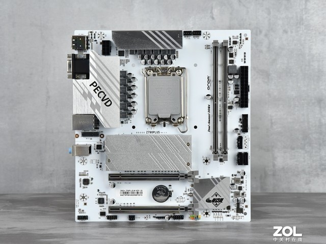 昂达 Z790 PLUS-W主板采用纯白色配色,采用紧凑型M-ATX板设计,尺寸为240mm×220mm,甚至可以放入一些小型机箱。除了涂白PCB,这款主板还采用了昂达PECVD防护技术。这两代昂达主板都采用了这种技术,可以使主板具有防溅、防尘、防潮、防盐雾、抗老化、防腐蚀等功能。在恶劣的环境下,它仍然可以稳定输出。