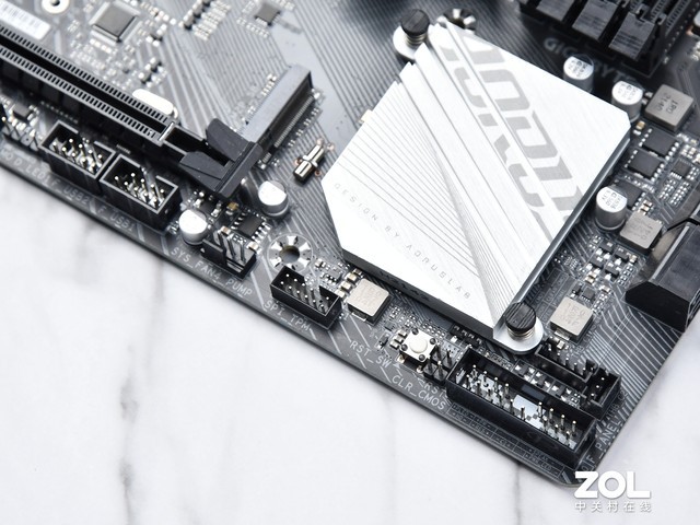 当然,不仅I.O区域接口丰富,这款主板的前置跳线还提供了大量的USB接口,主板的供电侧是USB3.2Gen2和USB3.2Gen1的前置跳线接口。