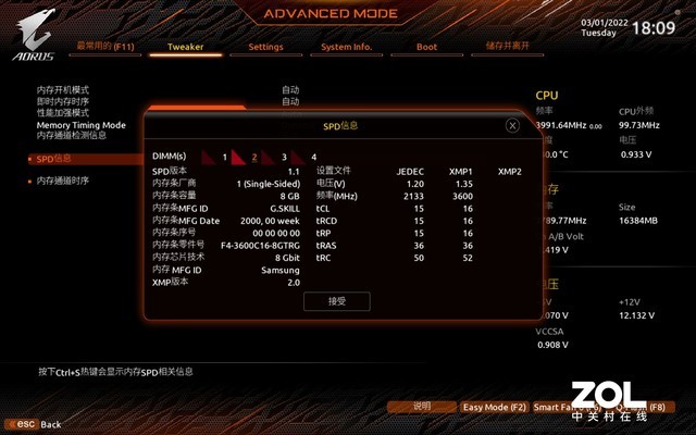 超频界面可设置内存XMP或超频内存,技嘉可查看BIOS集成内存SPD信息,方便超频设置。