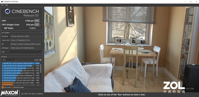 先对CINEBENCHR20进行测试,这个软件可以测试处理器的单线程和多线程基准性能。