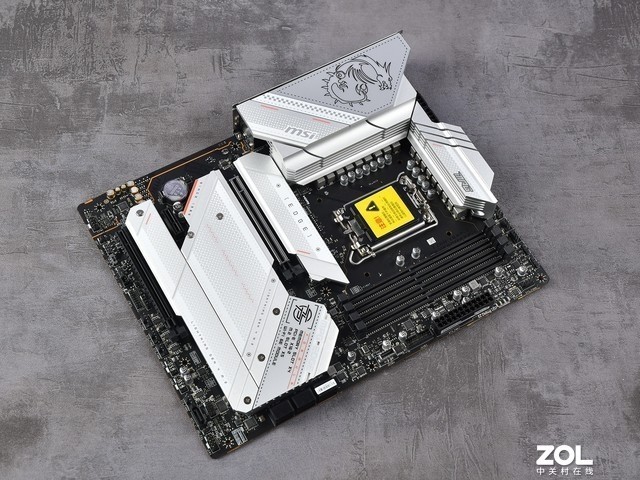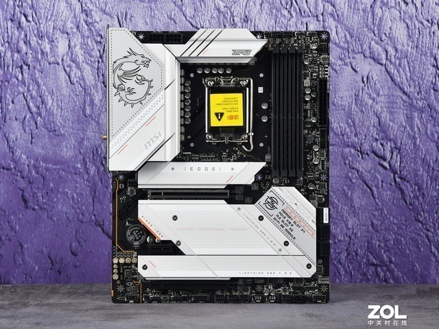 微星 Z790 EDGE WIFI DDR4 刀锋主板采用常规ATX板型,6层PCB设计。这种主板在配色方面与上一代刀锋没有什么不同,盔甲全部涂上橙色和银色,但PCB仍然是黑色的。VRM上方的盔甲微星标志性龙纹LOGO只有一个光效率。