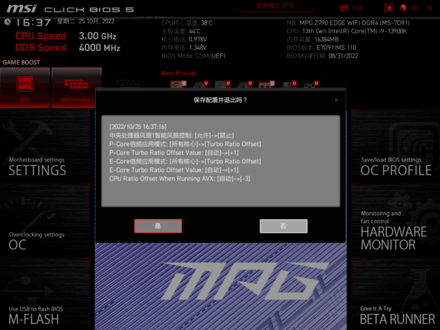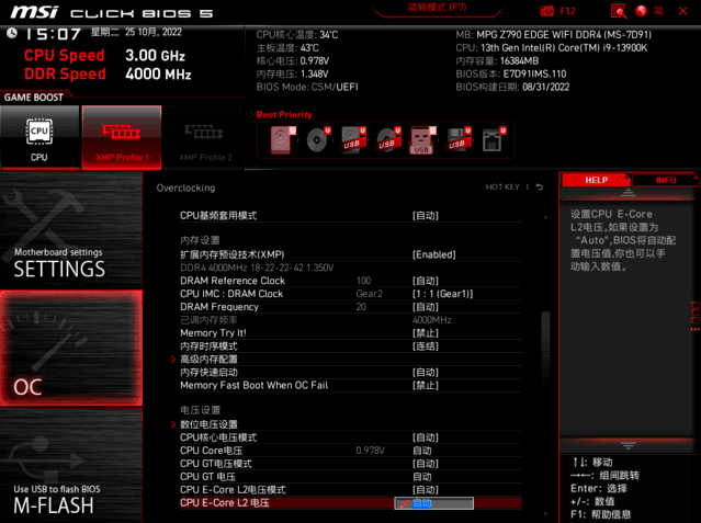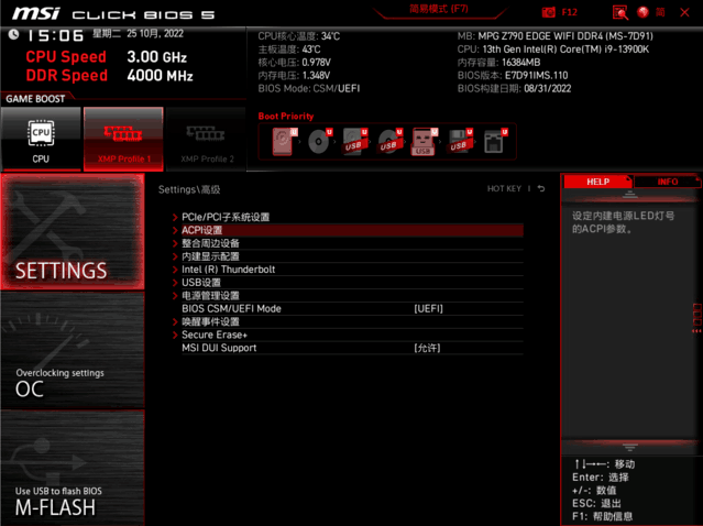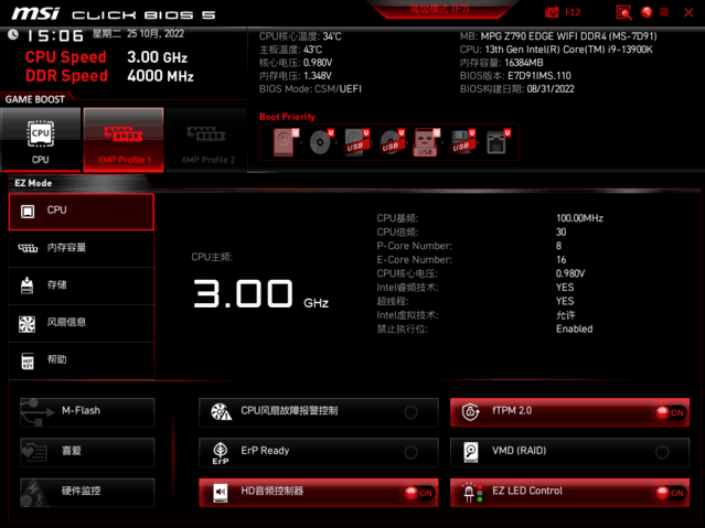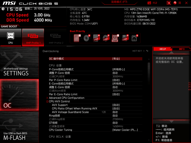 以下是微星 Z790 EDGE WIFI DDR4 刀锋主板BIOS,这一代Z790微星主板BIOS变化不大,风格依旧,完整的中文图形BIOS界面,主菜单提供快捷XMP,CPU一键超频GAMEBOOST设计,有条件可以全部开始,一般只开XMP。