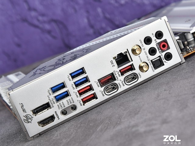 I/O区域微星为DP/HDMI两个视频接口,4个USB3.2Gen1TypeA接口,4个USB3.2Gen2TypeA接口,两个C口为USB3.2Gen2,一个为USB3.2Gen2x2。另外还有Wi-Fi6E天线接口,5个音频接口,BIOS快速重置和FlashBIOS按钮,2.5G有线网口。