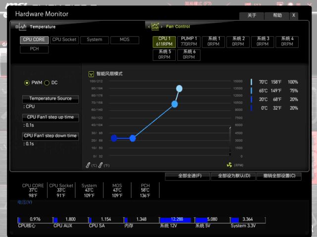 最终,HardwareMonitor界面在微星 BIOS中标志性,专门控制风扇。