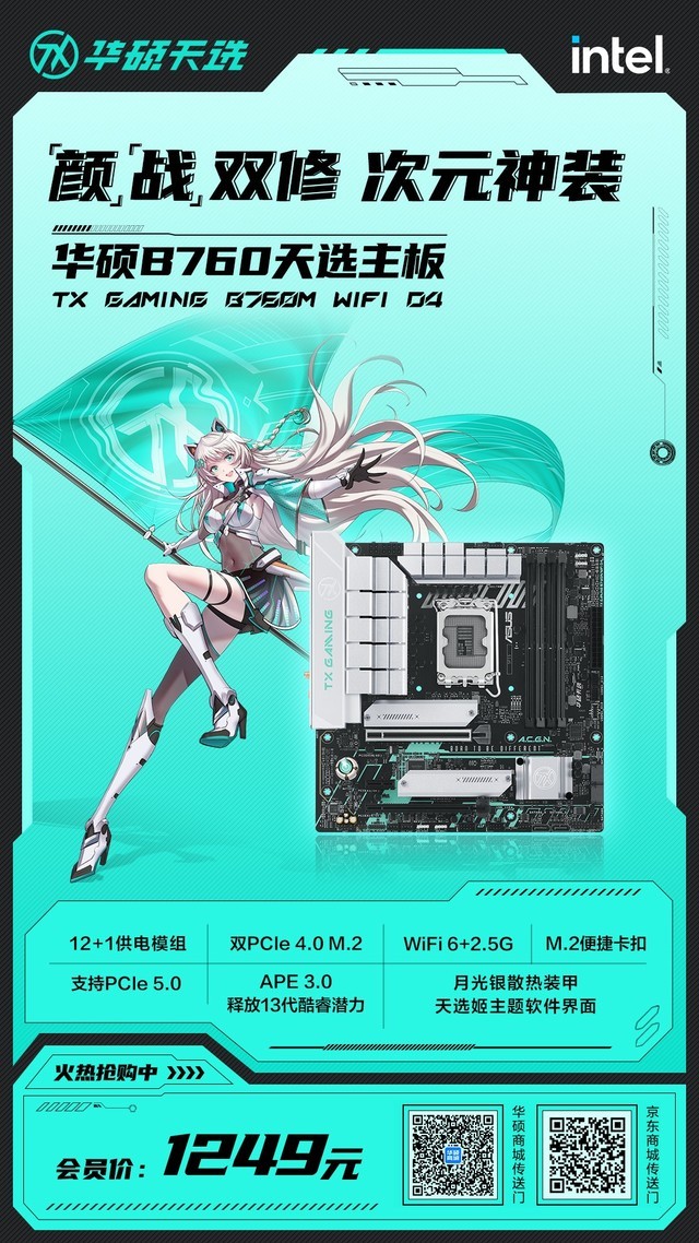 华硕 B760天选主板(TXGAMINGB760MWIFID4)是2023年华硕天选新产品发布会如期而至,天选家族新成员——华硕 B760天选主板(TXGAMINGB760MWIFID4)震撼降临!华硕 B760天选主板作为天选主板,具有超强的战斗力,是二次元爱好者和潮流玩家打造超次元装备的新选择。华硕 B760天选主板现已正式上市,售价1299元,限时会员活动价1249元,按需晒单返还50元E卡。点击下面链接或扫码前往购买页面,领略奇妙魅力!