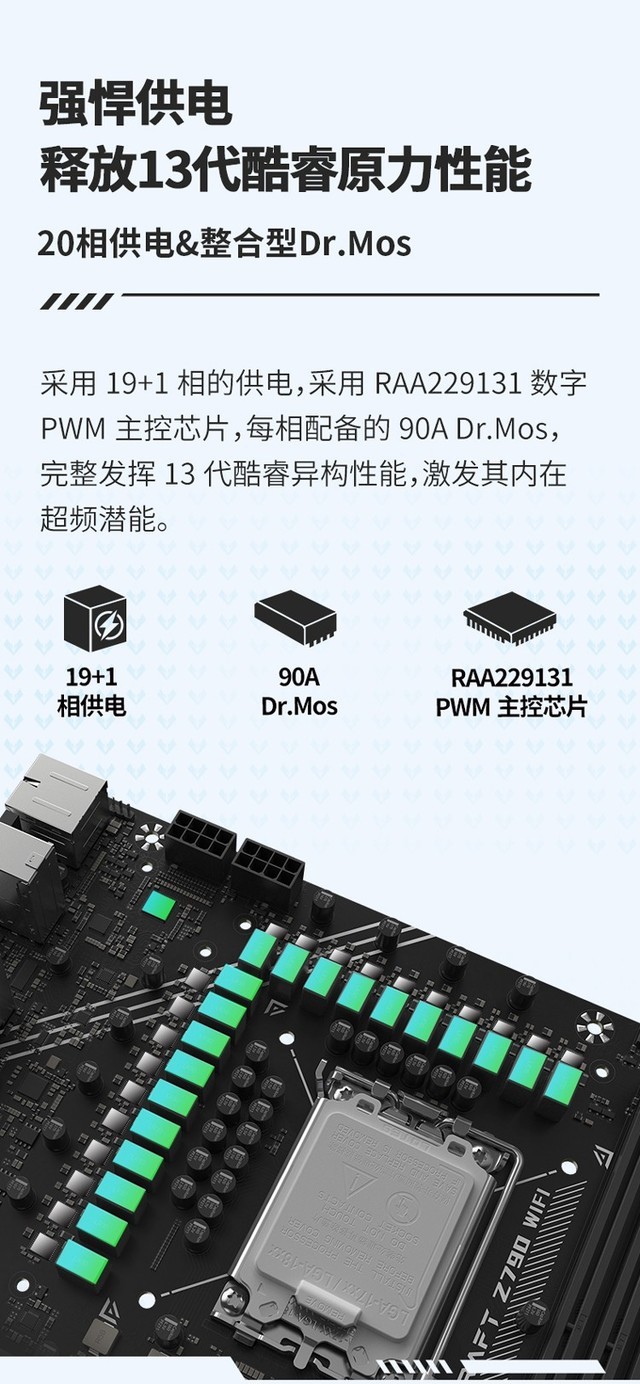 铭瑄 Z790 WIFI主板采用PWMRAA229131旗舰级数字供电,全新的PWM可以严格按照Intel的供电规范进行控制,使CPU处理器能够获得精确、完整的动力,使性能核、能效核和线程调度器都能很好地工作!经典的Dr.MosISL99390,每个相都可以承载90A电流,每个相都可以承载90A电流,支持400W+的功耗释放,配合i9-13900K处理器也可以轻松应对,更能激发其超频性能。