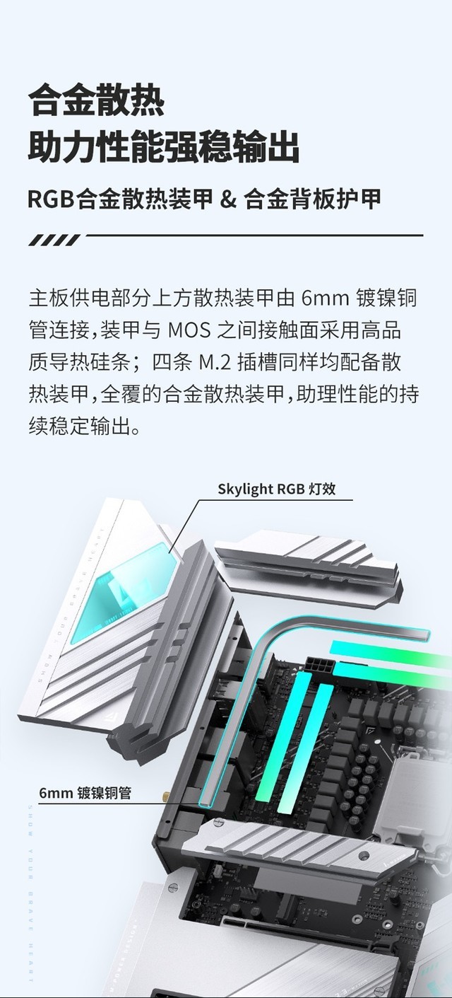 当然,大面积合金散热装甲的化学反应对于如此强大的供电是不可或缺的!两个巨大的VRM散热装甲由6毫米铜管连接,配合优质导热硅条,可以快速有效地排出热量;同样,M.2硬盘接口配备散热装甲,可以稳定压制新一代高性能硬盘;随着SkylightRGB灯效的加持,面值进一步提升。