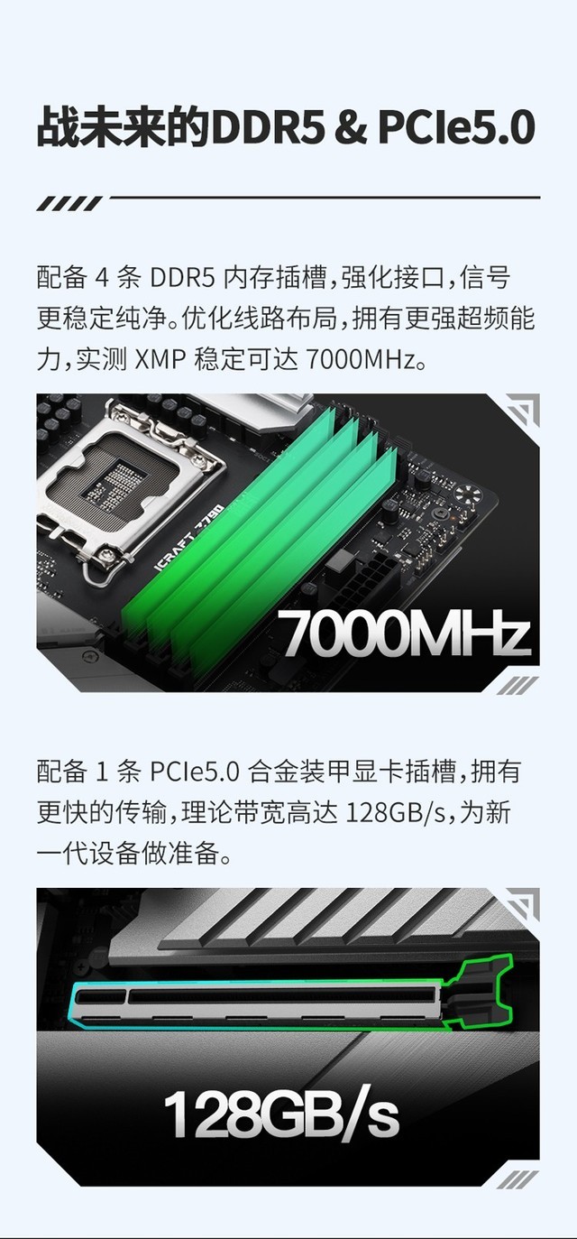 下一个时代的PCIe5.0接口和DDR5内存接口这样的新特性,铭瑄 Z790 WIFI当然是标准!其中,XMP内存可以稳定地达到700MHz。在PCIex16结构上,合金加固装甲也大大提高了主板的耐久性。