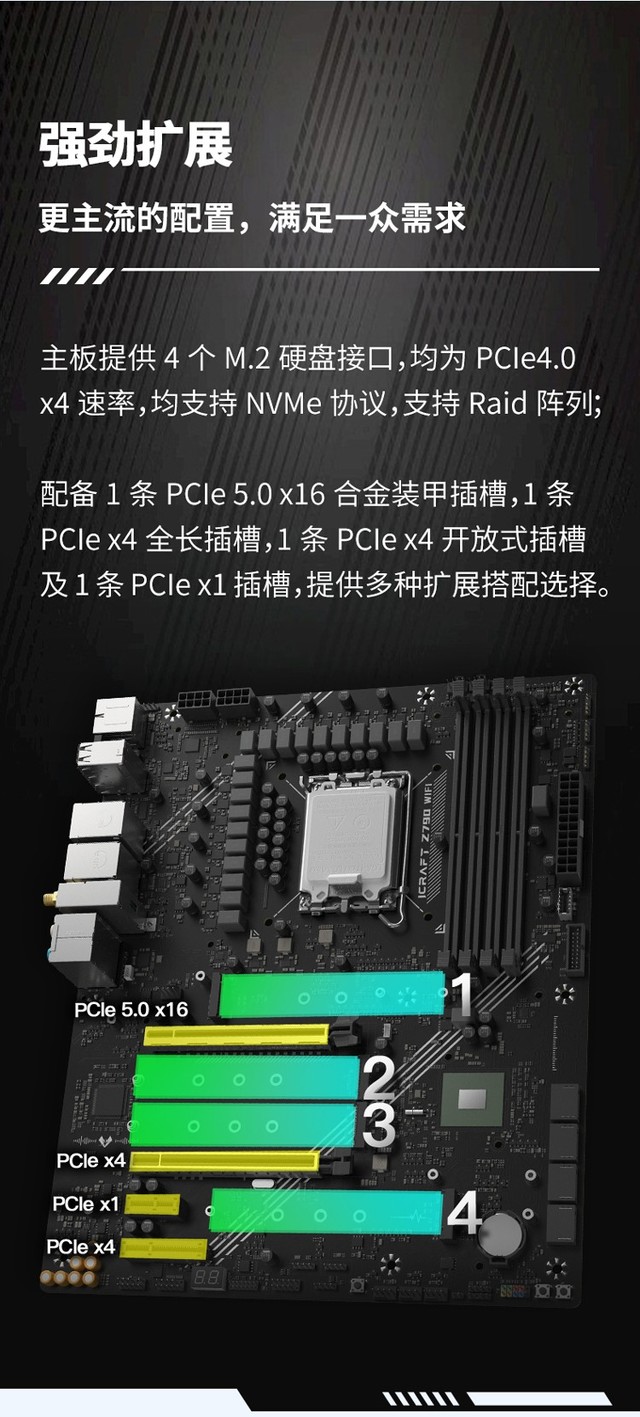 扩展方面,主板提供4个M.2硬盘接口,均为PCIe4.0x4速度,均支持NVMe协议,支持Raid阵列;配备1个PCIe5.0x16合金装甲插槽,1个PCIex4全长插槽,1个PCIex4开放插槽,1个PCIex1插槽,提供多种扩展搭配选择。