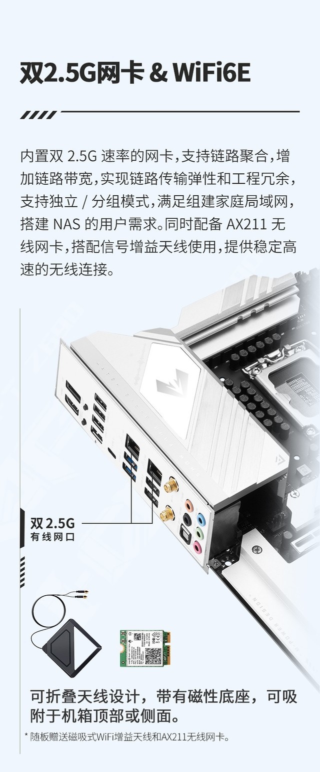 主板还内置了双2.5G速度网卡,支持链路聚合,增加链路带宽,实现链路传输弹性和工程冗余,支持独立/分组模式,满足建立家庭局域网和建立NAS的用户需求。同时配备AX211无线网卡,配合信号增益天线,提供稳定高速的无线连接。